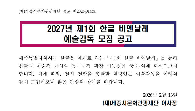 2027년 제1회 한글 비엔날레 예술감독 모집 공고