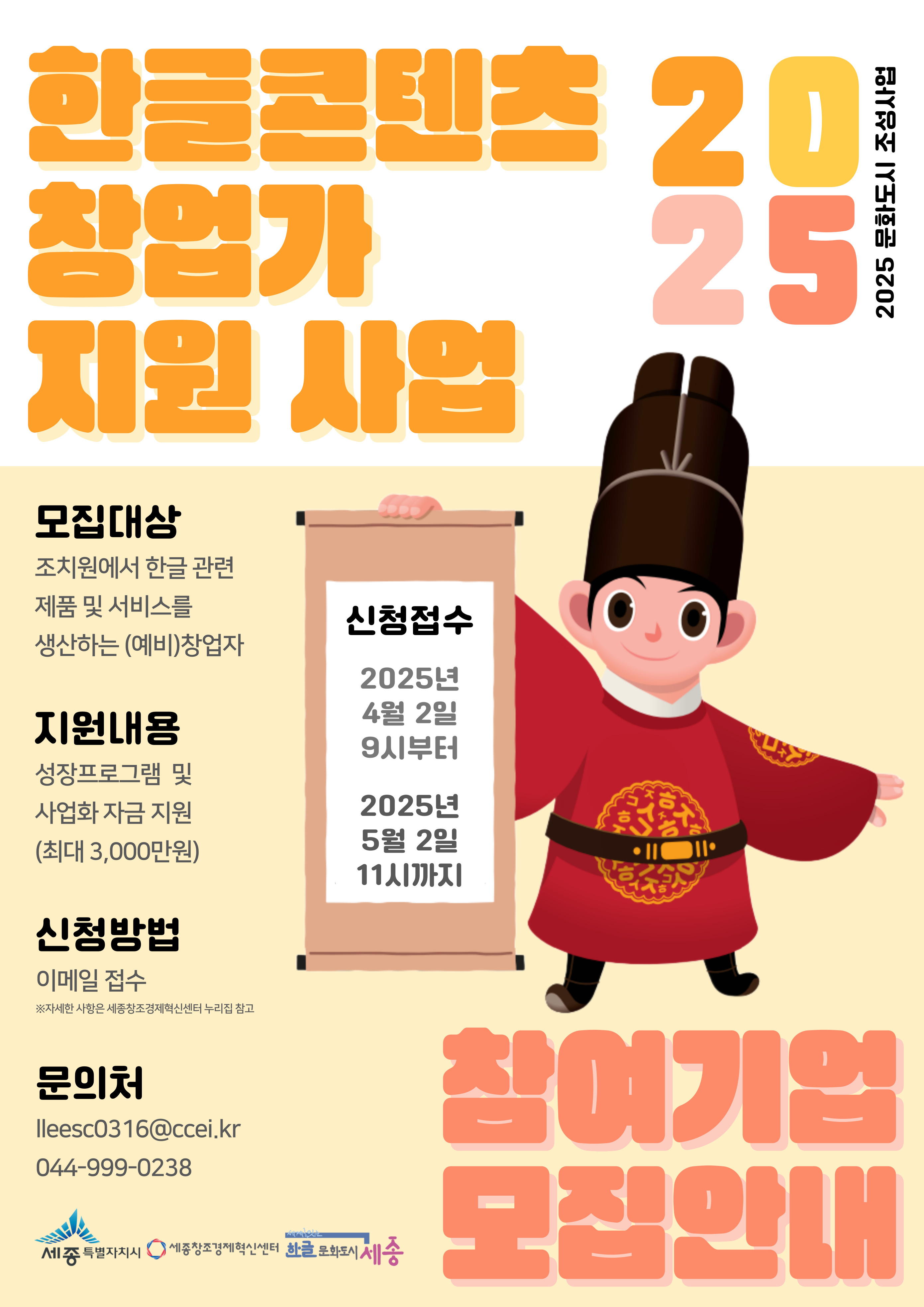 로컬콘텐츠타운(조치원) 내 한글관련 사업 아이템을 보유한 창업가를 발굴하고 한글문화 확산을 한 사업 활동을 장려하여 한글 콘텐츠 생산 및 소비 활성화 지원